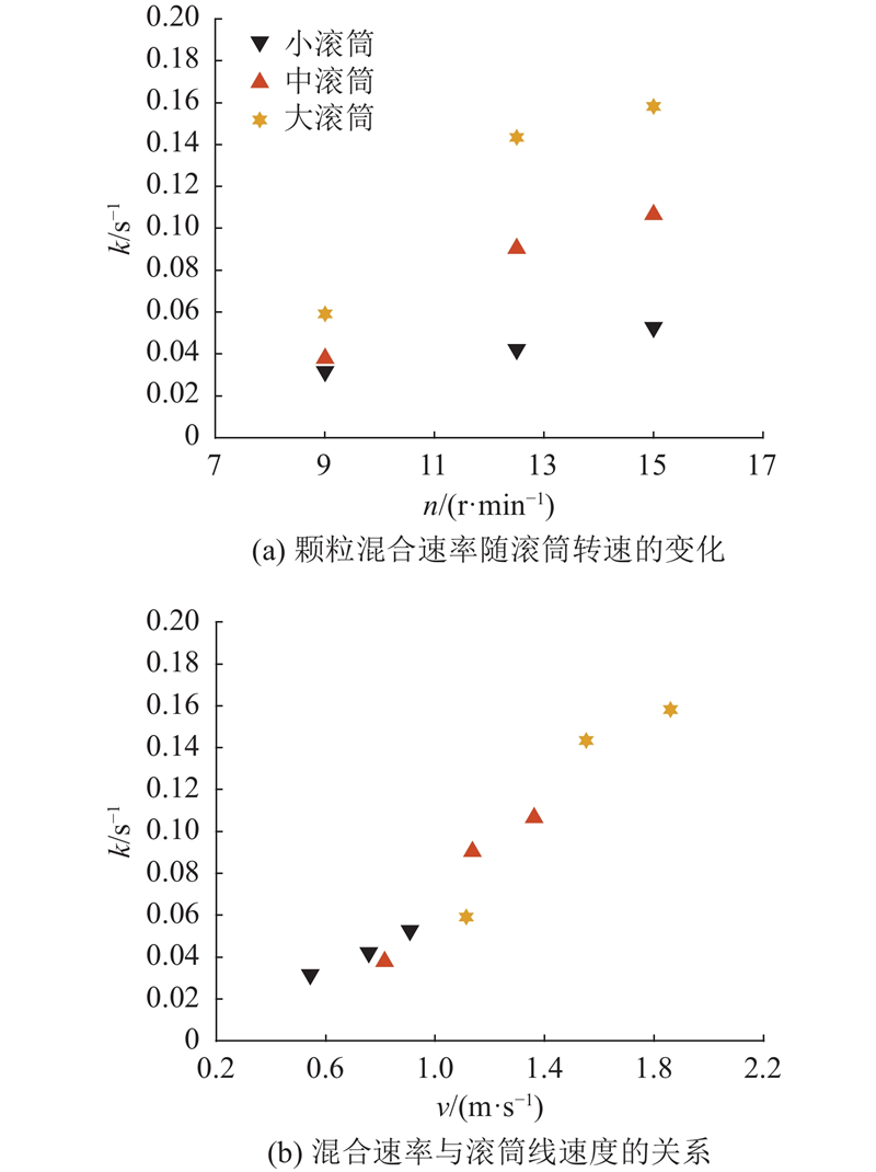(3) 滚筒转速的影响. 在当前考察的转速范围内,转速对动态休止角的影响较小. 颗粒混合速率随着转速的升高而增加,且该增加程度随着滚筒半径的增大而更加显著. 发现颗粒混合速率与滚筒壁面线速度几乎呈线性关系,从而得到一种简洁的方法对颗粒混合速率进行估算.