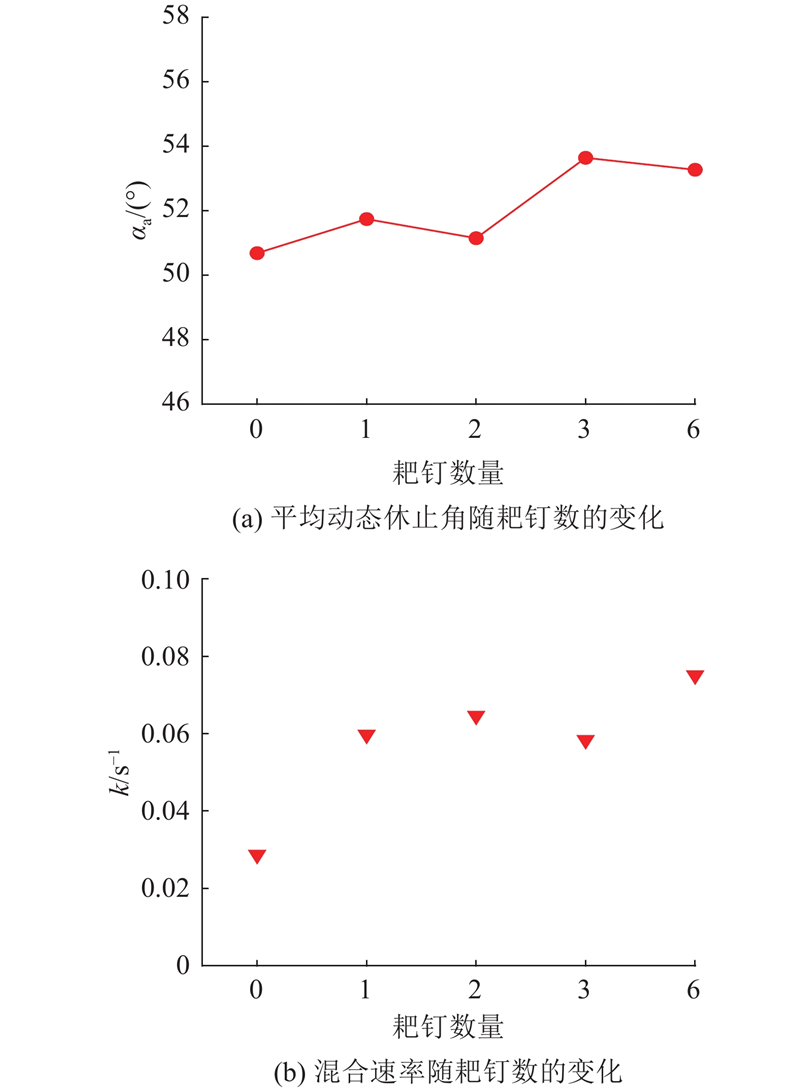 (4) 滚筒内壁安装耙钉的影响. 与无耙钉的情况相比,安装耙钉,可以显著地增大动态休止角. 采用适当的耙钉数量和长度,可以实现较大的混合速率.