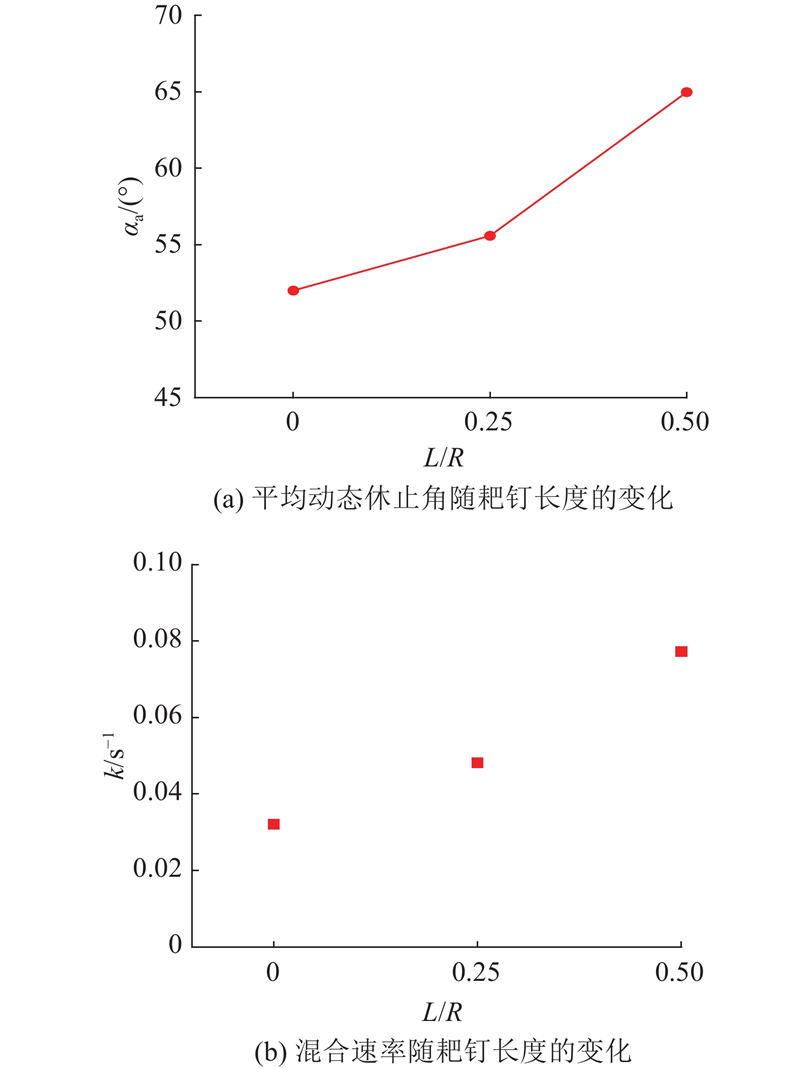 如图15(a)、(b)所示为耙钉长度的影响. 随着无量纲化的耙钉长度L/R的增大,平均动态休止角和混合速率都近似于线性增长. 耙钉除了能够进一步提升烟丝颗粒高度外,还能够起到打散颗粒团簇和促进混合的作用.