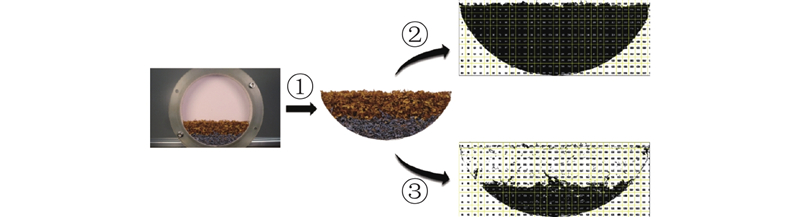 3)框选颗粒床的表面区域,提取并导出边缘坐标数据. 利用MATLAB®处理坐标数据,用直线拟合表面剖面曲线,直线水平倾角为动态休止角.