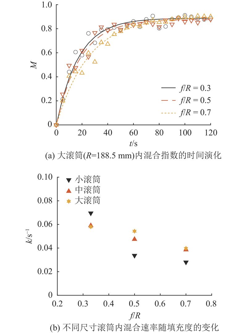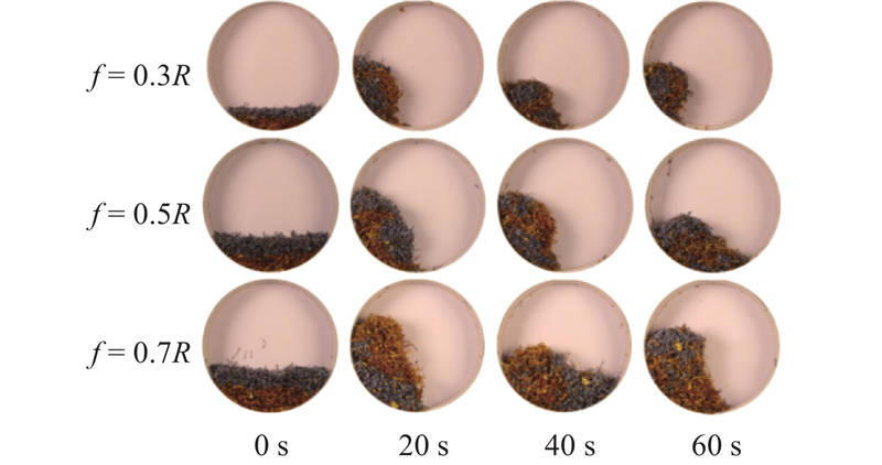 探究颗粒填充度和滚筒尺寸对颗粒在滚筒内运动混合行为的影响. 采用颗粒床高f与滚筒半径R的比值来定量表征颗粒的填充程度,分别设置f/R = 0.3、0.5和0.7的实验组,保持滚筒转速