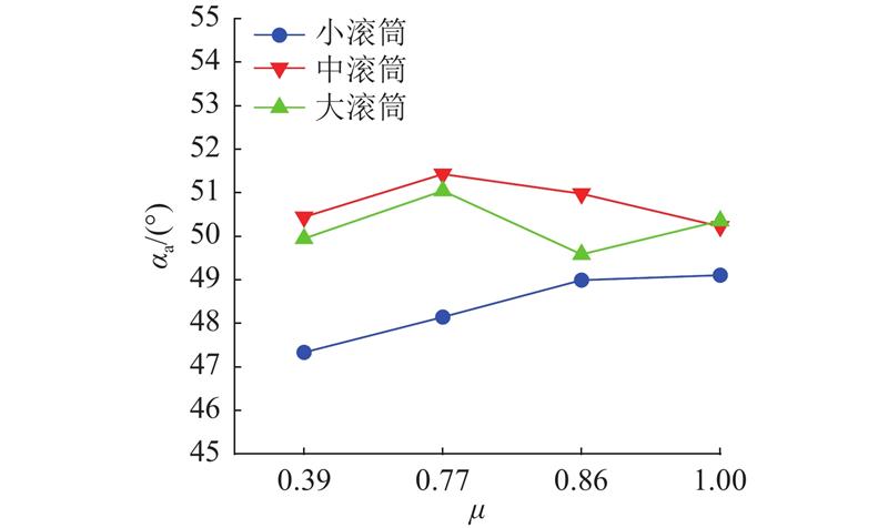 如图9所示,对于小滚筒,随着摩擦系数的增加,颗粒壁面摩擦力增大,颗粒被提升到更高的位置,动态休止角增大. 在相同的转速下,滚筒半径越大,颗粒的向心力越大,颗粒和壁面的法向接触力就越大. 最大切向力或滑动摩擦力等于摩擦系数乘以法向力. 若滚筒半径足够大,在较小的摩擦系数条件下也能获得足够大的切向力或摩擦力,实现颗粒堆的提升. 在这种情况下,继续增大摩擦系数,则不会再增大提升能力和动态休止角. 对于中滚筒和大滚筒,动态休止角受摩擦系数的影响呈现小幅波动的趋势,说明颗粒壁面摩擦力在较小的摩擦系数下已经饱和,动态休止角对摩擦系数不敏感.