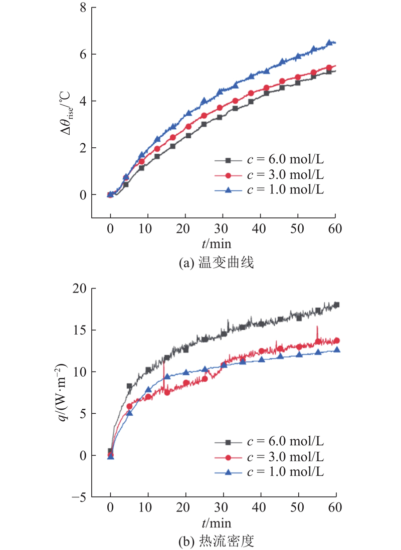 如图4所示为铝-空气燃料电池分别在电解液浓度c为1.0、3.0和6.0 mol/L 条件下的温度和表面热流密度变化规律(θa = 20 ℃,J = 20 mA/cm2).