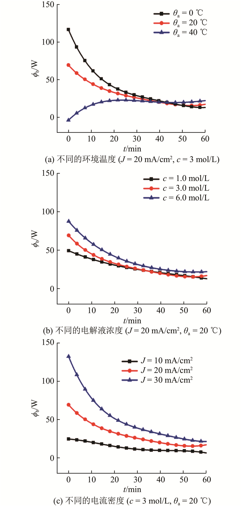 如图3所示为铝-空气电池分别在0、20和 40 ℃环境温度θa下,当电流密度J = 20 mA/cm2时的内部温度和外部热流密度变化规律. 电池的电解液浓度为3.0 mol/L,工作时间截取为1 h.