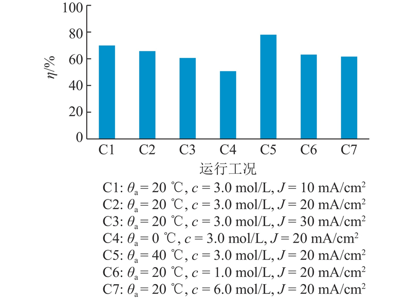 从图8可知,铝-空气电池在每一工况下的放电效率均高于50%,且当环境温度及电池电流密度增大时,电池的放电效率随之增大. 当环境温度为40 ℃时,电池放电效率最高可达78%. 当电池的电解液浓度由3.0 mol/L变为1.0 mol/L和6.0 mol/L时,铝-空气电池的放电效率降低. 原因如下. 1)当电解液浓度较低时,氢氧根离子对铝表面的反应较弱,使电池的关系性能减弱. 2)随着氢氧化钾溶液浓度的升高,铝金属表面腐蚀加剧,电流增大,但当浓度过高时,氢氧根离子吸附在铝金属表面会阻碍铝的继续溶解,电流的增大速度会变缓,从而减弱电池的工作性能. 铝-空气电池的放电效率与电池放出的电能、热能有关,当电池工作电压越高(见图7),生热量越小时,电池化学能转化为电能的效率越高,则电池的放电效率越高.