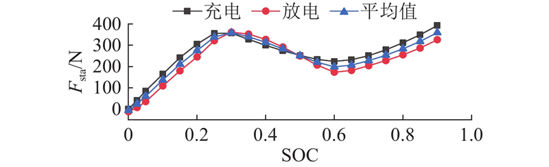 根据静置实验结果可知,电池断电静置1.5 h后,表面原位膨胀力的变化率已降至0.1 N/min,可以视作稳定. 取静置1.5 h时电池的表面原位膨胀力为电池在该SOC下的稳定膨胀力Fsta,代表了电池内部应力和锂离子浓度平衡后的稳定状态,从而反映了电池的总体机械变形情况. 绘制磷酸铁锂电池的SOC-Fsta曲线,如图10所示.