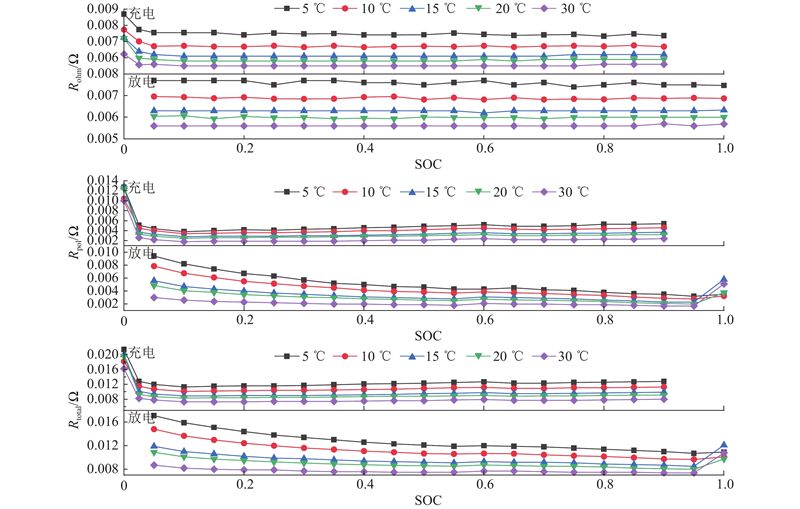 电池的内阻特性与环境温度密切相关,不同温度下的充放电内阻存在显著差异. 按照2.1节的实验方法,测量磷酸铁锂电池在5、10、15、20、30 ℃下充放电的Rohm、Rpol、Rtotal,绘制相应的内阻曲线,如图11所示.