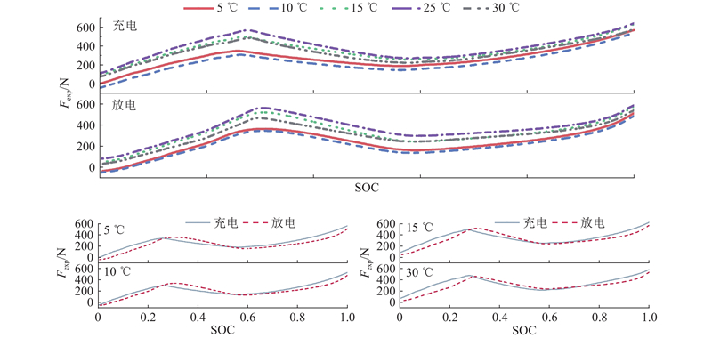 按照3.1节的实验方法,分别在5、10、15、30 ℃环境温度下测量电池以1 A电流充放电时不同SOC下的表面原位膨胀力Fexp,绘制不同环境温度下电池充放电表面原位膨胀力随SOC的变化曲线,如图13所示.