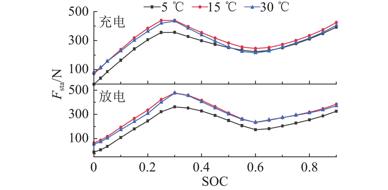 按照3.2节的实验方法,在5、15、30 ℃3个环境温度下测量电池的稳定膨胀力Fsta,绘制不同温度下电池充放电稳定原位膨胀力随SOC的变化曲线,如图14所示.