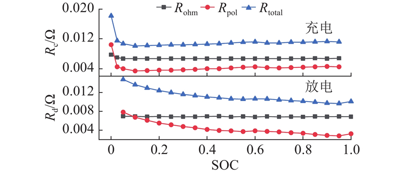 内阻是磷酸铁锂电池的关键技术指标,不仅影响电池的功率输出,还对电池的健康状态监测起到重要作用. 采用混合功率脉冲测试(hybrid pulse power characteristic, HPPC)在多个温度测量不同SOC下的电池充放电欧姆内阻Rohm、极化内阻Rpol和总内阻Rtotal,后文分析内阻与温度的关系. 通过实验,得到磷酸铁锂电池在10 ℃环境温度、不同SOC下的充电内阻Rc和放电内阻Rd曲线,如图4所示.