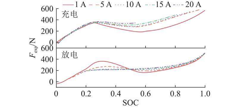实验继续分别使用5、10、15、20 A的电流,重复上述充放电实验. 根据实验数据,绘制不同电流下电池充放电膨胀力Fexp随SOC的变化曲线,如图7所示.
