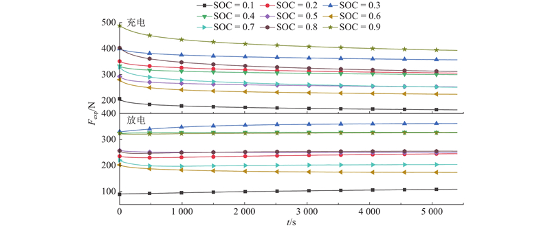 通过实验,获得不同SOC下电池在充放电静置期的表面原位膨胀力Fexp随时间t的恢复情况,如图8所示.