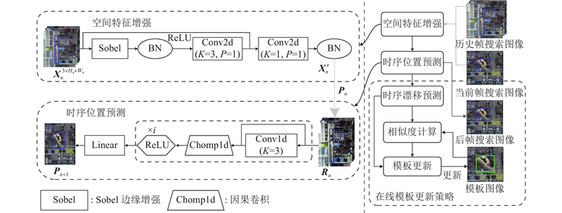 ... 基于相关滤波的跟踪算法[6 ] 利用频域特征的相关性和持续更新策略优化跟踪模型,但容易因背景和特征变化的干扰而引入冗余信息,导致跟踪漂移问题频发. 基于孪生架构的跟踪算法[7 ] 持续对模板区域和搜索区域进行相似性特征匹配,以实现目标跟踪.孪生跟踪算法虽然兼具较高的精度和运行速度,但是依赖于模型的特征学习和匹配能力. 算法SiamRPN[8 ] 融合区域候选网络,有效缓解了目标状态变化带来的性能损失. 算法SiamFC++[9 ] 和SiamCPN[10 ] 利用高效的无锚框方法预测目标的边界框,显著提高了模型的跟踪效率. 同时期,其他模型开始关注于对时序信息[11 ] 的利用,完善模板更新机制[12 ] . KeepTrack[13 ] 融合外观特征和位置得分,利用图神经网络建立时空特征关联,评估模板更新效果. 算法TAN[14 ] 聚合时间编码和多帧模板特征信息,实现了有效的时空建模. 由于缺失模板区域和搜索区域之间有效的特征关联,且无法维持长时序的时空建模,该模型在复杂场景中难以维持长时间的鲁棒性. ...