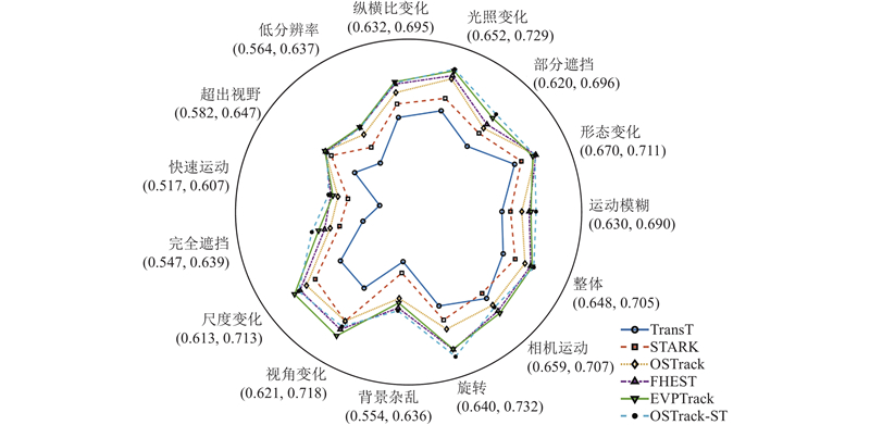 Tab.1 算法 LaSOT GOT-10k AUC/% P norm /%P /%AO/% SR50 /% SR75 /% SiamRPN[8 ] 43.7 47.8 41.5 40.8 46.4 19.8 TAN[14 ] 47.4 53.5 45.3 — — — SiamFC++[9 ] 54.1 62.2 54.6 59.4 69.3 47.1 TransT[16 ] 64.8 73.7 69.0 66.9 76.7 60.8 STARK[17 ] 67.2 76.9 — 68.9 78.0 64.2 KeepTrack[13 ] 67.3 77.4 70.4 68.3 79.3 61.0 MixViT[23 ] 68.7 78.4 74.3 70.4 79.8 67.9 OSTrack[26 ] 69.0 78.6 75.1 70.9 80.2 68.2 SwinTrack[21 ] 69.2 78.3 74.0 69.4 78.0 64.3 AiATrack[18 ] 69.3 79.2 73.5 69.9 80.1 63.5 FEHST[22 ] 70.1 78.8 75.1 71.4 81.7 68.3 LGTrack[24 ] 70.2 80.4 76.4 72.4 82.3 69.6 EVPTrack[25 ] 70.4 80.6 77.4 73.3 83.6 70.7 OSTrack-ST 70.5 80.8 77.1 73.7 84.1 71.4