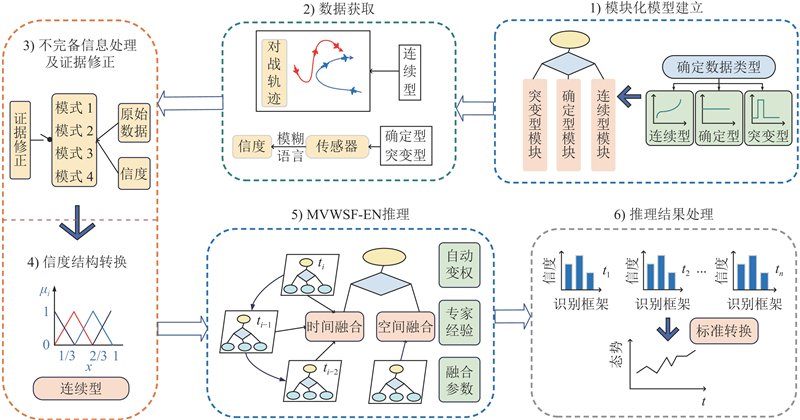 为了解决不完备信息下的态势评估难题,MVWSF-EN在传统的EN基础上融入三大机制:不完备信息处理及证据修正﹑节点自适应权值生成以及3步时空融合. 推理过程如下.