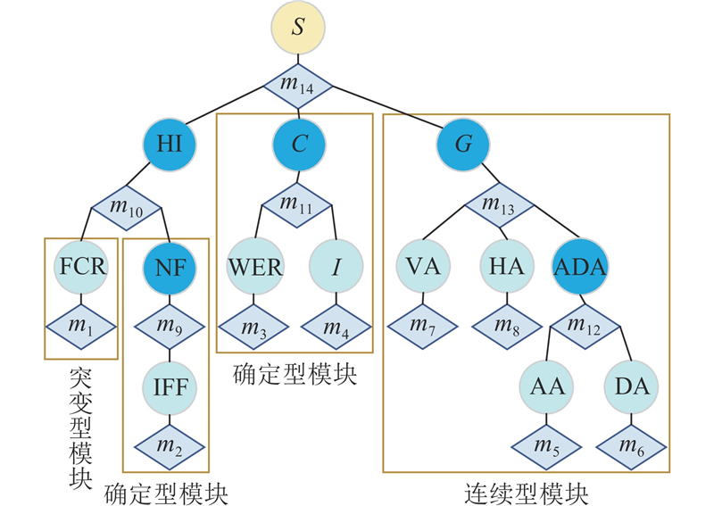 该模型依据态势信息的时间关联性,划分为突变型、确定型和连续型3类. 其中,突变型由于在时间上不相关,具有不可预测性;连续型呈现规律性时序变化,确定型是在一定时段内保持稳定或缓慢变化,两者均具有时间序列的特征,可以进行预测. 各证据节点的物理含义、识别框架、模块类型定义如表1所示,其中上层节点的识别框架和模块类型由于待融合及约简无法确定,用“—”表示.
