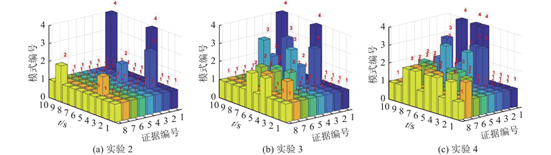 依据1.3节的证据修正方法(见图3和表3),得到不完备信息实验(实验2~4)的证据输入模式切换情况,如图8所示. 可见,随着证据信息不完备程度的加剧,非“1”的输入模式占比逐渐增大,达到了有效修正证据的目的. 从3个实验(实验2~4)中选取不同类型证据进行输入模式切换及修正过程,说明如下. 实验2中,突变型证据FCR(编号1)在t4时刻缺失,直接进行节点删除操作,因此由t3时刻的模式1切换为模式4. 实验3中确定型证据IFF(编号2)在t7时刻检测到信度为{0.1,0.5, 0.1},存在失真,但由于IFF不满足“前3个时刻信息均有效”的预测条件,将其用前一时刻的有效证据替代,由t6时刻的模式1变为模式3. 实验4中证据VA(编号7)在t5时刻的检测值为0 m/s(即数据缺失),按照1.3.1节的连续型证据预测方法进行数据预测,预测结果为186.705 2 m/s,检测值与预测值的误差超出规定阈值5 m/s. 采用预测值替代,由t4时刻的模式1变为t5时刻的模式2.