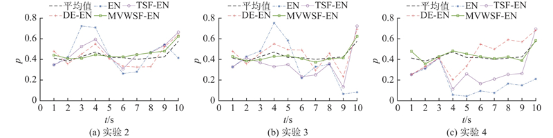 将修正后并经信度结构转换(见1.4节)的4组证据输入MVWSF-EN中,根据1.5.3节的推理操作,获取我方相对敌方的10个时刻态势等级. 为了验证本文方法的优越性,开展与EN、变权时空融合EN(TSF-EN)及基于邓熵修正证据的EN(DE-EN)在不完备信息下(实验2~4)的推理结果对比,如图9所示. 其中平均值为将实验1可靠证据输入EN和MVWSF-EN后,对推理的态势值取平均,作为态势期望衡量误差. 因DE-EN未明确不完备信息表述规则,开展如下处理:突变型信息将空集信度分配置1;非突变型信息对前两时刻信息进行不确定处理后,计算邓熵折扣系数,依据改进的合成公式[7]获取当前信息信度分配函数的修正结果.