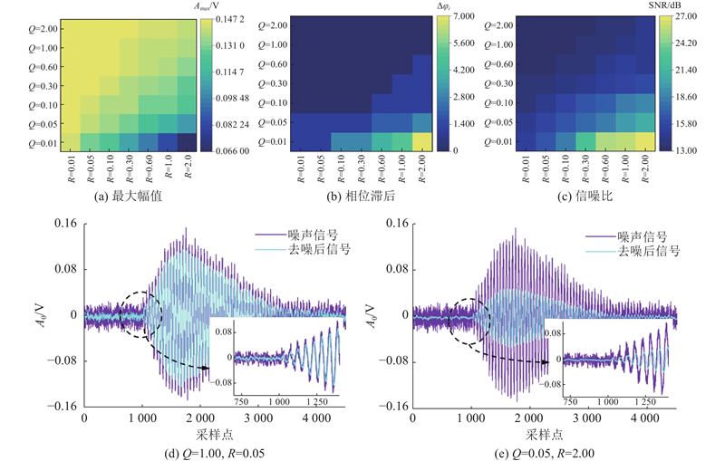 Fig.1 Effects of different Q,R value combinations on filtering results (amplitude, SNR, and phase delay)