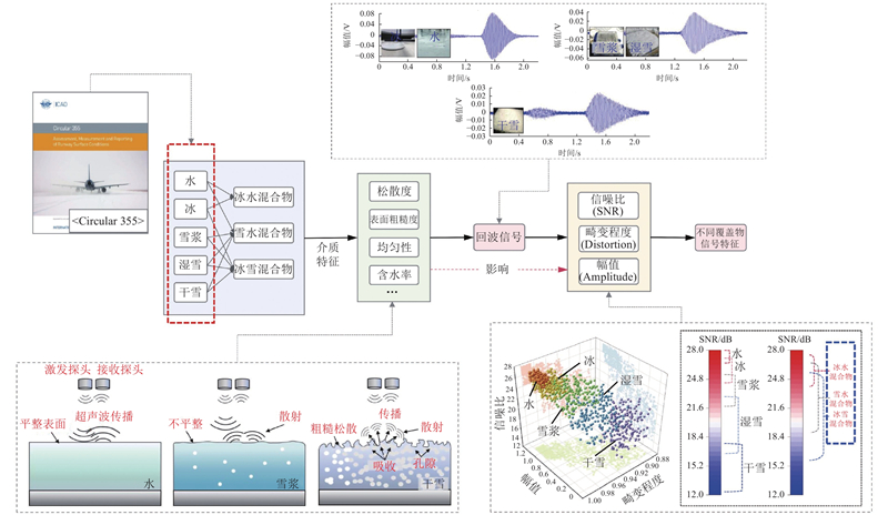 根据ICAO《Circular 355》GRF要求,重点研究了水、冰、雪浆、湿雪和干雪5种污染物状态,同时对冰水、冰雪、水雪混合覆盖物进行了测试. 通过分析不同覆盖物的回波信号特征发现:水和冰的回波信号具有较高的幅值和信噪比,波形与标准指数模型吻合度好;湿雪和雪浆则表现出幅值降低,波形畸变、波形前沿畸变严重,及信号拖尾延长等特征;干雪由于多孔结构和粗糙表面,导致信号能量大幅衰减,信噪比显著下降. 混合覆盖物的信号特征介于其组成成分之间,其信噪比和幅值分布包含在水和干雪的区间范围内. 不同覆盖物(包括水/冰/雪浆/湿雪/干雪和混合覆盖物)的信噪比和波形特征研究流程如图10所示. 进一步分析表明,冰、水及冰水混合物的信号特征集中分布在高信噪比区域,而各类雪覆盖物则分散在低信噪比区域,其中干雪的信号最为离散. 基于研究低信噪比条件下ToF估计精度的核心目标,并响应GRF规范需求,本研究选取水、冰、雪浆、湿雪和干雪5种典型GRF覆盖物作为研究对象.