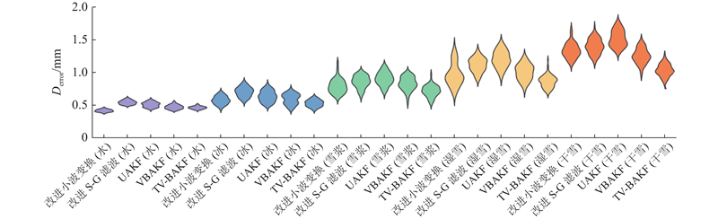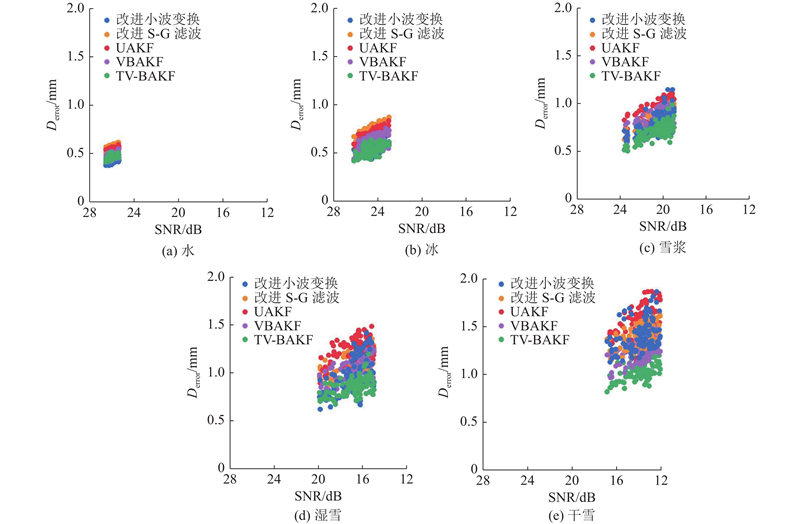 (3) TV-BAKF方法在处理较高信噪比(水、冰)覆盖物回波信号时,计算误差和小波及VBAKF方法差异较小;而对于松散且表面粗糙(干/湿雪)覆盖物回波信号,TV-BAKF相比其他方法仍能够对ToF进行准确估计,并能够将深度精度提升至1 mm以内.