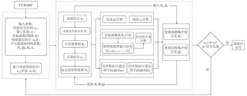 综上,卡尔曼滤波方法依然存在以下问题: 1) 在低信噪比条件下,滤波对信号前沿的噪声抑制较差; 2)滤波后信号平滑度较差,影响过零点位置估计; 3)滤波后信号失真严重,影响特征点判断; 4)可能存在明显的相位滞后问题. 这些问题将影响起振点位置和ToF估计准确性,进而降低覆盖物深度计算精度. 因此,本研究提出结合总变差和贝叶斯估计的自适应卡尔曼滤波方法(TV-BAKF),动态调整
