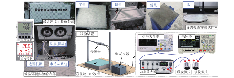 为了验证所提出的信号滤波方法提取冰雪覆盖物回波信号起振点的能力,在课题组自主研发的低温环境实验舱中开展了冰雪水超声波回波信号测试. 该实验舱配备了造雪设备、水冷却系统、风扇及温/湿度控制系统,可调节舱内温度和湿度,并通过控制造雪机进水与进气比例来改变雪的含水率. 结合温湿度控制与流动水雾化系统,实验舱成功制造出干雪、湿雪和雪浆等多种雪样. 课题组还通过中国北方实地雪样的光谱测试验证了模拟雪样的真实性,基于光谱分析,课题组研发的低温环境舱制造的雪和真实世界雪特性一致. 测试系统采用40 kHz空气探头、示波器、放大器和信号发生器,其中探头距离覆盖物为20 cm. 低温环境舱、各类覆盖物样本及试验装置如图4所示.