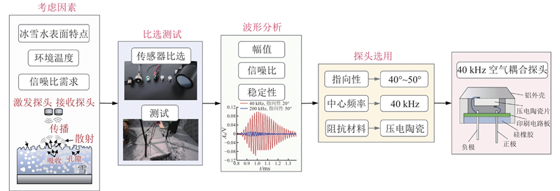 针对冰雪水介质表面的复杂反射特性(雪表面粗糙多孔、冰表面裂缝)、低温环境及高精度ToF测量对信噪比的要求,首先进行超声探头比选,如图5所示. 其中,t为时间. 通过低温环境箱试验,测试了不同频率、指向性和阻抗层材料的探头. 发现较高频率探头(200 kHz)信号因波长小于表面不平整度,导致强散射,回波幅值低(<0.1V)且信噪比较低;40 kHz波长(
