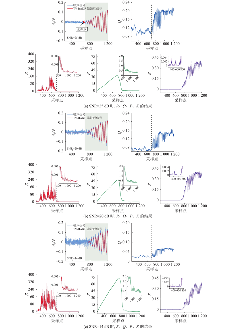 TV-BAKF通过总差分预处理技术能够获取信号的噪声分布特征并实现参数动态调整. 在信号处理过程中,Q和R会根据信号特征进行协同调节:在信噪比较低的零线及信号前沿段,Q自适应性降低使滤波器更信任预测结果,同时R相应增大以抑制测量噪声影响;在波包段则呈现相反趋势,Q增大而R自适应性减小以提高观测权重,这种自适应调节在起振点前后表现尤为明显(如黑色虚线标示),特别是在低信噪比区域(信噪比<20 dB)调节幅度明显. 实验结果表明,该机制使TV-BAKF在14~40 dB的信噪比范围内均能保持良好的滤波性能,有效抑制噪声干扰.