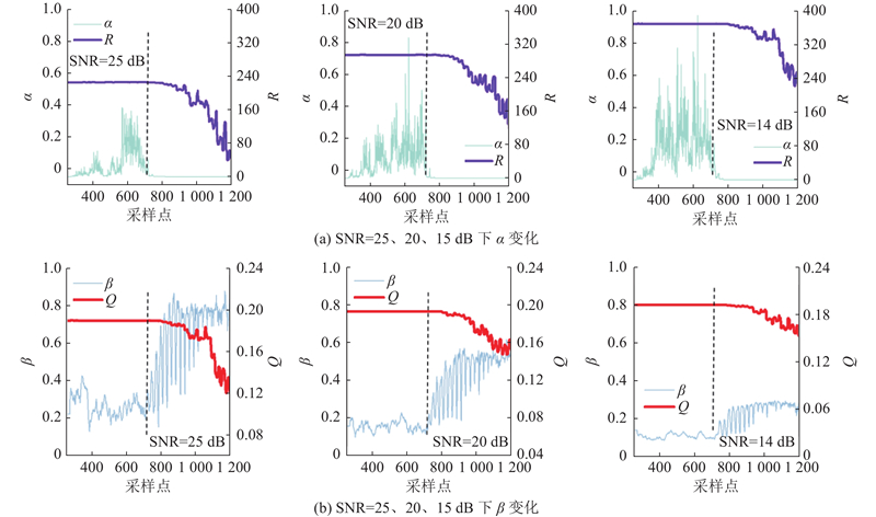 如图7所示展示了贝叶斯估计动态调整遗忘因子α 和 β的结果. 在信号零线位置,由于信号变化平缓且观测噪声占主导,α 和 β趋近于1.0,滤波器更信任预测值;而在波包段信号变化显著时,α 和 β明显减小,使滤波器更依赖当前观测数据. 信噪比的影响表现为:低信噪比时α 和 β趋近1.0(依赖历史信息),高信噪比时趋近0(信任当前观测).