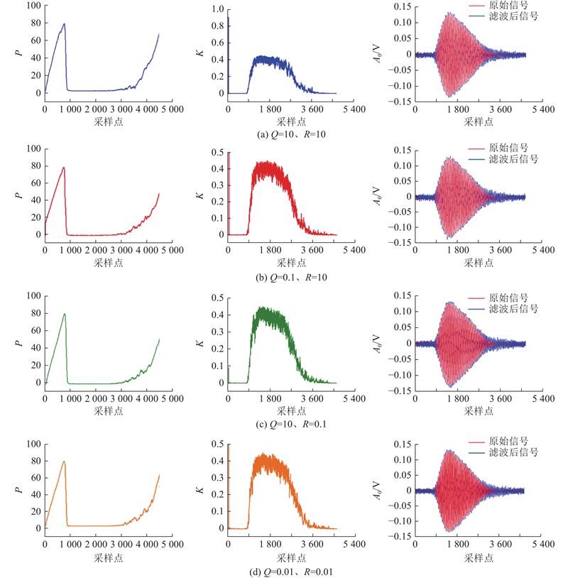 图 8 4种Q、R初参数组合下P和K变化及滤波效果