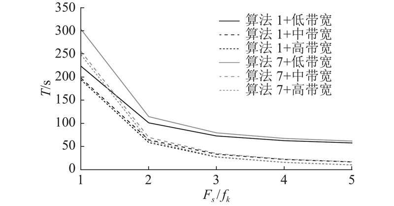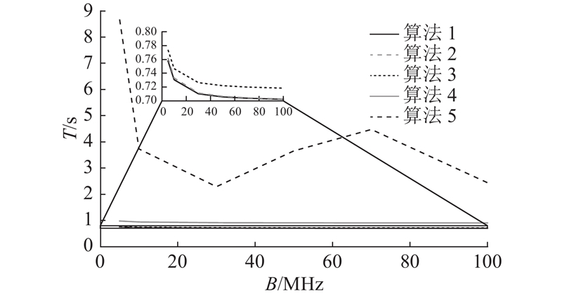 对于算法6,由于计算任务只在本地进行,整体的时延不受基站算力和无线频谱资源的影响,通过公式可以计算得到在如上的配置下,只在本地进行计算任务需要897.33 s,是个定值. 如图6、7所示,其中