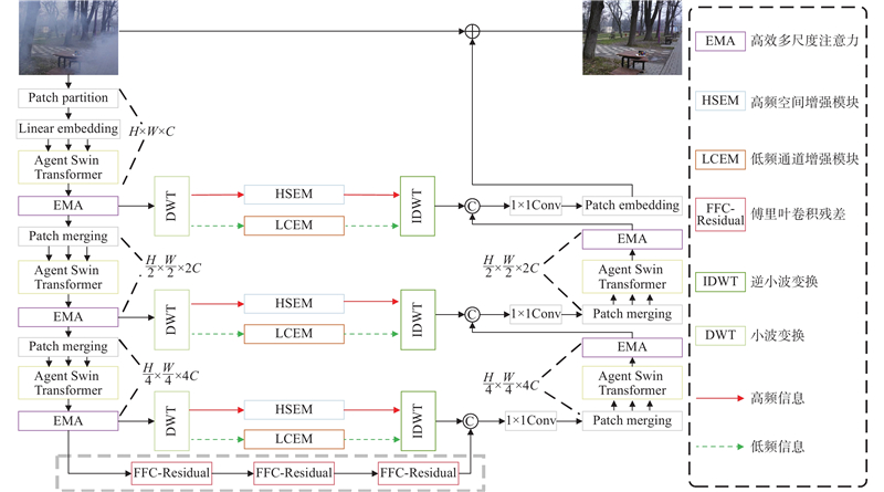 针对以上深度学习图像去雾问题,本研究提出代理注意力下域特征交互的高效图像去雾算法,具体贡献如下:1)构建代理注意力下的Swin Transformer编解码网络,在提取多尺度特征的同时,显著提高模型处理效率. 同时,编解码器通过级联高效多尺度注意力模块,增强空间和通道特征信息的流动,提升网络理解能力. 2)设计高频空间增强模块和低频通道增强模块,在提高频域特征利用率的同时,以低计算复杂度的特征提取操作充分提取频域特征,动态调整网络对频域特征的关注,实现有效的信息补偿. 3)在编码器中间层设计快速傅里叶卷积密集残差结构,利用空间和频谱信息去雾,提升恢复雾图观感. 同时,利用密集残差连接缓解深层网络梯度消失的问题.