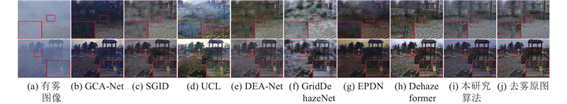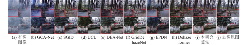 如图9所示展示了本研究算法与对比算法在NH-HAZE数据集上的测试结果. 可以看出,GCA-Net、EPDN在浓雾区域去雾能力不足,且GCA-Net产生明显偏色. SGID、DEA-Net、GridDehazeNet产生了伪影,且细节丢失较多,边缘纹理模糊. UCL特征映射不准确,导致第1个场景中椅子在去雾图像中消失,且树干产生了伪影. Dehazeformer的去雾效果和本研究方法接近,但相较之下本研究方法保留了更多的细节信息,如局部放大中椅子的轮廓更加清晰.