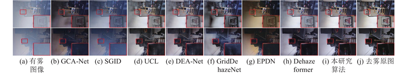I-HAZE是室内浓雾数据集,通过该数据集评估本研究方法在雾气感知和细节保留方面的性能. 如图11所示,GCA-Net、EPDN恢复的图像产生明显偏色,且较为暗淡,细节信息丢失较多. SGID在处理室内图像时泛化能力不足,恢复图像中残留雾气明显. UCL、DEA-Net、Dehazeformer在局部细节保留方面同样存在不足,尤其在远景部分,模糊现象较为突出. GridDehazeNet在墙面产生明显伪影,相较之下,本研究方法细节保留充分,边缘纹理清晰,雾气去除彻底.