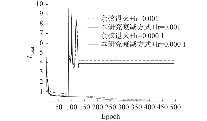 本研究算法基于PyTorch 框架实现,并在 NVIDIA V100 GPU 的 Ubuntu 环境下进行训练. 初始学习率设为10−4,采用Adam优化器[26](