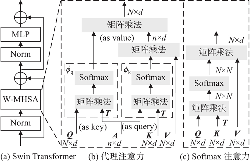 为了提取雾图深层次语义特征,以如图2(a)所示的Swin Transformer为基础,设计U-Net结构的多尺度特征提取网络. Swin Transformer基于如图2(c)所示的Softmax注意力建立当前块与其余块的依赖关系,为模型提供了强大的全局建模能力,但这也导致其计算复杂度随图像尺度的平方增长,且在特征提取过程中产生冗余,导致模型收敛慢,处理效率低. 为此,引入维度为n×d的代理矩阵