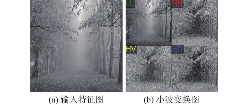 为了在图像去雾过程中保留更多的细节信息,通过小波变换,将每级编码器的输出转换到频域进行特征提取. 其中,高频信息对应图像的边缘和纹理细节,低频特征对应图像的亮度、颜色、饱和度等结构信息. 针对高低频特征的表征不同,设计空间增强模块和通道增强模块,在频域提取特征并增强. 增强后的特征通过小波逆变换恢复空间域特征图并送入解码器中,补偿丢失的特征.