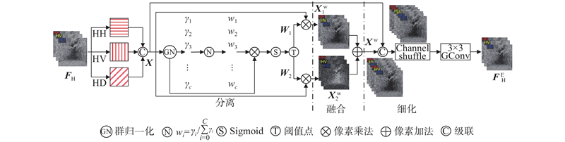 高频特征信息量少,若直接对3幅高频特征图进行连续卷积操作,会产生大量的空间特征冗余. 针对以上问题,构造如图5所示的高频空间增强模块. 该模块通过分离、融合、细化3个步骤,实现对细节信息的增强,同时减少特征提取过程中的空间冗余.