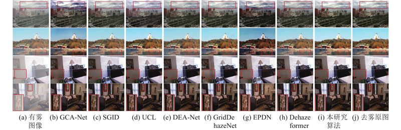 如图8所示展示了本研究算法与对比算法在RESIDE数据集(SOTS)上的测试结果. 对于室外场景,GCA和EPDN的去雾图像出现了过饱和现象,特别是在天空、湖面和树林区域. UCL在第1个场景的天空出现了轻微偏色;SGID、DEA-Net和Dehazeformer在远景区域去雾不彻底,尤其是在景深突变区域,如第2个场景湖面与天空之间的过渡区. GridDehazeNet与本研究算法的整体去雾效果接近,但前者在第1个场景偏亮,导致树林颜色淡化. 对于室内场景,GCA-Net去雾不彻底,如第3个场景的墙面和第4个场景的桌面均有雾气残留;GridDehazeNet和Dehazeformer在第3个场景的墙面也存在去雾不彻底;EPDN则导致第4个场景墙面过亮. 其余3种算法的去雾效果较接近. 相比之下,本研究方法的细节保留更加完整.