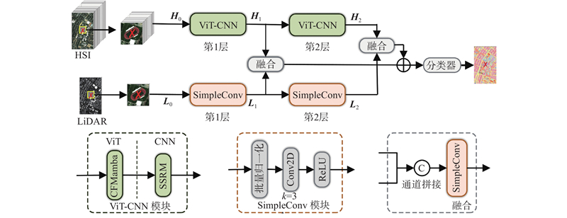 针对上述问题,本研究提出强调中心感知的非对称建模策略. 在HSI分支中,构建了ViT-CNN结构:在特征建模初期引入ViT,以融合全局上下文信息,不仅通过差异化的上下文编码增强了对中心区域的感知能力,也为后续CNN的特征学习提供了全局先验,丰富了特征表达空间. 在LiDAR分支中,采用轻量级卷积模块(simple convolution, SimpleConv),专注于高程与结构信息的提取. 该策略通过为2个模态设计差异化的特征提取结构,不仅提升了对各自建模需求的适配性,从而缓解了建模冗余与冲突问题;同时强化了高光谱分支的特征表达能力,增强了对中心区域的感知能力,从而有效提升了分类性能.