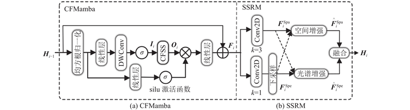 考虑到CNN-ViT结构(见图2(a))在辨别性特征方面提取能力的不足,在HSI分支中,提出ViT-CNN结构(见图2(b)),首先由ViT建模全局语义,再由CNN细化局部细节. 该结构有助于在建模初期引入全局上下文信息,为后续的局部特征学习提供丰富的信息支撑,从而实现更具判别性的特征表达. 其中,ViT部分引入CFMamba模块,结合中心像素分类任务的特点,通过差异化的上下文建模增强对中心区域的表征能力,同时捕捉像素间的全局依赖关系,提升对复杂空间结构的感知能力;CNN部分则引入SSRM,从空间与光谱2个维度细化特征,增强对边缘与细节信息的感知能力. LiDAR分支采用SimpleConv结构,使用