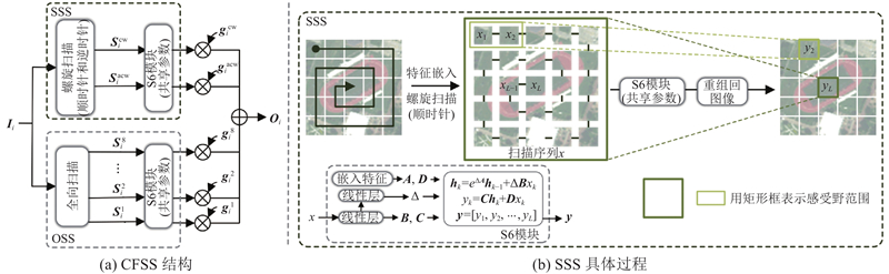 为了实现差异化上下文编码,在ViT的设计中引入中心聚焦Mamba模块(central-focus Mamba, CFMamba),其核心机制为中心聚焦选择性扫描机制(central-focus selective scan, CFSS),由全向扫描(omnidirectional selective scan, OSS)[13]与螺旋扫描(spiral selective scan, SSS)组成,兼顾全局感知能力与对中心区域的重点关注. 在此基础上,进一步提出基于CNN的空间-光谱细化模块(spatial-spectral refinement module, SSRM),通过多维度的细粒度优化,提升特征表达的质量与最终分类性能.
