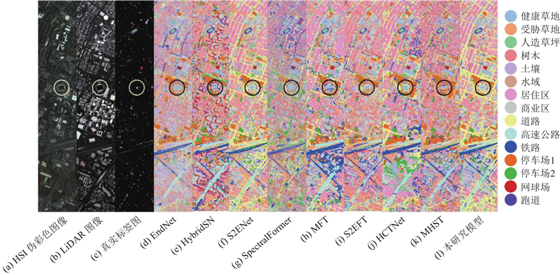 为了全面验证所提方法的有效性,选取多种具有代表性的先进方法进行对比,涵盖对称与非对称结构,以及CNN、ViT和CNN-ViT这3类架构. 基于CNN的方法如下:1)ENDNet[4],采用编码器-解码器结构并引入重构损失以增强特征表达能力;2)S2ENet[14],在融合前分别强化HSI的空间特征与LiDAR的光谱信息;3)HybridSN[19],先通过三维卷积提取局部光谱-空间特征,再使用二维卷积以降低计算复杂度. 基于ViT的方法如下:1)SpectralFormer[20]通过通道嵌入构建ViT tokens,以建模光谱维度的全局依赖关系;2)MFT[6]将HSI映射为一系列tokens,将LiDAR作为class token引入非对称建模机制. 基于CNN-ViT的方法如下:1)S2EFT[5]在SpectralFormer的基础上引入空间注意力模块以提升空间建模能力;2)HCTNet[7]对HSI与LiDAR分别采用三维和二维卷积提取特征,随后通过ViT进一步建模;MHST[9]并行设置CNN与ViT分支,以融合多尺度的局部与全局特征. 其中,MFT、S2EFT和HCTNet采用非对称结构,其余方法均为对称建模策略.