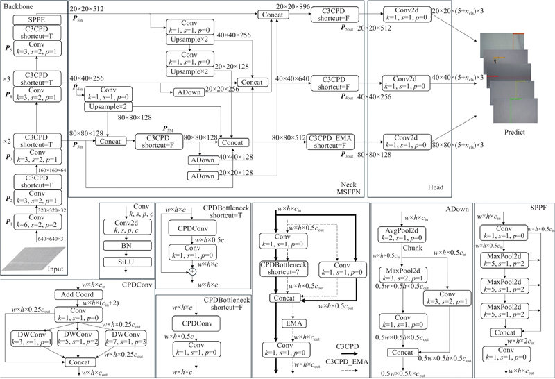所提出的CPD-YOLO模型结构如图1所示. 其中,w为特征图宽度,h为特征图高度,k为卷积核尺寸,s为步长,p为零填充大小,c为卷积核个数. 其检测步骤如下:采集织物缺陷图片作为输入的图像,调整图片分辨率为640×640,Backbone不断深入提取图片特征信息,MSFPN融合从骨干中提取的不同深度的特定特征图,检测层Head根据融合后的特征回归及分类目标,最后输出预测框及置信度.