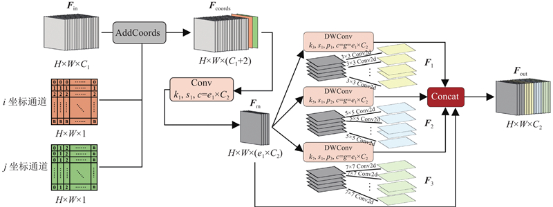 纺织工业生产的织物表面可能存在不同尺寸并且分布位置随机的缺陷,为此设计了添加坐标的并行深度卷积模块(coordinate parallel depthwise convolution, CPDConv),通过不同尺寸卷积核提取到不同尺度特征以适应不同尺寸的织物缺陷,其结构如图2所示. 其中,e1为通道膨胀率,实验中e1设为0.25. CPDConv对图像特征提取过程如下:1)引入CoordConv的思想,在输入特征通道数