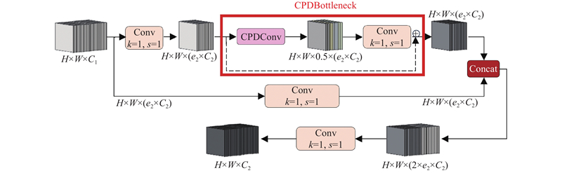 在研究中,基于CPDConv重构特征提取模块C3CPD进行实验,C3CPD模块如图3所示. 其中,e2为通道膨胀率,e2设为0.5. 3×3卷积使通过CPDConv模块拼接的特征图中各个独立的通道间产生关联,减少深度卷积由于未跨通道学习而丢失的信息,并进一步提取丰富的特征信息. CPDConv能够更加准确感知到图像像素点的全局位置并有效提取到不同尺度的特征信息,提高各种尺寸以及纵横比大的缺陷检出率与检测精度,另外,采用深度卷积与C3CPD降通道操作能大幅减少模型参数和计算量.