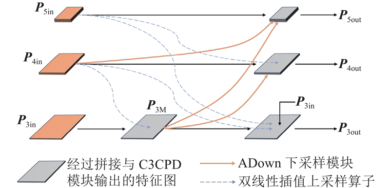 深度卷积神经网络具有类似金字塔层次的固有多尺度特征,以此构建自顶向下的横向连接结构被称为特征金字塔网络(feature pyramid network, FPN)[20]. 在YOLO模型中,特征融合采用自顶向下的FPN与自底向上的PAN相结合的方式. 然而,该方式中非相邻层只能通过中间层进行信息的传递,存在信息退化甚至丢失的问题,阻碍模型检测精度.