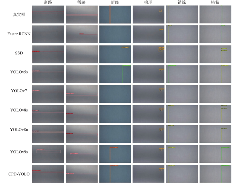 为了直观展示CPD-YOLO对ZY数据集中6类缺陷检测的优越性,如图7所示,将Faster R-CNN、SSD、YOLOv5s、YOLOv7、YOLOv8s、YOLOv9s 、YOLOv10s、YOLO11s、CPD-YOLO对原图检测后产生的可视化结果进行对比. 通过各模型结果对比可以看出,各模型都能够较好地检出棉球,而对于大纵横比缺陷的检测,其他模型都大量出现了缺陷分类错误、缺陷漏检、背景误检以及缺陷区域定位不精确等现象. 例如,Faster RCNN、SSD无法有效检出大纵横比缺陷,严重漏检;YOLOv5s、YOLOv8s可以检出大部分缺陷,但不能有效区分成像外观相似的不同类别;YOLOv9s、 YOLOv10s、YOLO11s的预测框定位缺陷区域不完整. 而CPD-YOLO对大纵横比缺陷的检测能力较强,成像外观相似缺陷的错检率以及背景部分的误检率都显著低于其他目标检测模型,并且预测框标注的缺陷位置更加精确.