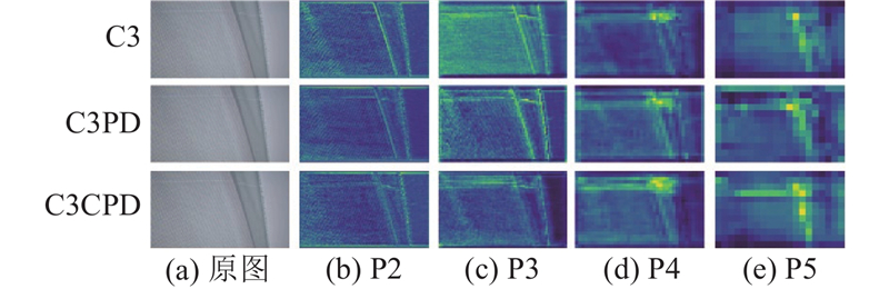 本研究设计的特征提取模块中有2个关键操作,即使用不同尺寸的深度卷积核并行提取图片特征和为每个像素点添加坐标. 为了评估这2个操作给图片特征提取带来的影响,对比经过不同特征提取模块后输出的特征图,如图8所示. C3PD使用并行多尺寸的卷积核,能够提取到比C3更多的几何特征信息;C3CPD为输入图片中每个像素点添加坐标,使卷积局部运算时也能获得全局的空间位置信息,比C3PD关注更多位置信息,突出缺陷部分,并抑制布匹隆起和背景纹理干扰因素的负面影响.